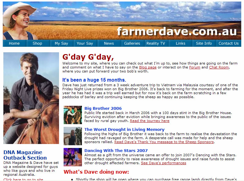 David needed a platform to continue his message of acceptance of gays in rural areas and I had the knowledge, time and desire. www.farmerdave.com.au was born. A few months later I travelled to Dave's farm with a group of forum friends to meet Dave in person and trial run a Farm Stay. I remember that meeting well. I'd spent months building the site - which included editing a lot of images. Meeting him in person was like a 2 dimensional image morphing into 3D.