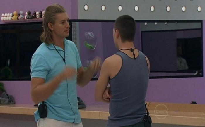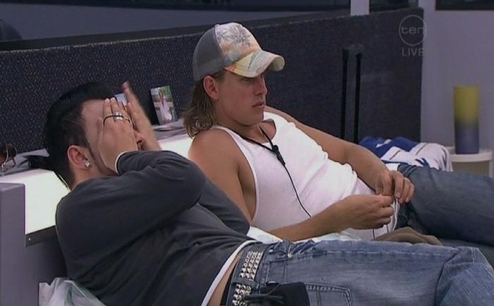 Katie and Jamie are in the bathroom. Katie says she doesn't really have a problem with being nominated but can't look the other housemates in the eye any more. Jamie doesn't know what to think, he is obviously disappointed about being nominated. 8.41pm - Jamie, Katie and John are in the spa. Jamie is very annoyed and says that Camilla Rob and David are grouping together and are the main cause of them being nominated. John says at this point of the game it.s easy to vote strategically. Katie says she knows exactly her reasons for being nominated - her messiness and she just isn't fitting in at the moment. Katie says there are two sides going on in the house now. Jamie says he's tried to get along with Rob but it just doesn't happen. He says Rob's character is very sneaky and a bitchy person. Jamie knows Rob nominated him because Rob couldn't look at him afterwards. Jamie says there are three groups - them, the girls and the gays. The girls and the gays have banded together according to Jamie to vote out their group. John was suss about Claire. Big Brother calls all three of them to the diary room. Meanwhile in the sauna Gaelan and Ashley wonder why they are getting in trouble. To pass the time they start air guitaring and banging the water bucket as a drum. . 11.59pm - David asks Katie and Jamie about their nominations. They both thought they'd be up. Jamie says Gaelan and Ashley have sorta been off on their own and if there are people in their group people would have picked on it would have been Jamie and Katie. Katie begins talking about how she thinks she was nominated because of her uncleanliness. Big Brother interrupts and fines Katie for discussing possible nomination reasons. Katie: Drilled, so drilled! This has been a great night. BB then fines Jamie. He doesn't seem to care. Katie recaps: a nomination, a strike and a $5000 fine each in one night. Katie: This has been the best night of my life! Gaelan comments in the bedroom the couple must be taking their nomination pretty harsh and spiteful if these strikes and fines are happening. Claire says it shows the lack of maturity levels. David: Cheeky little bastards. Day 54Rob and David are having a chat in the bedroom. Rob asks how long David expects to be in the house. David doesn't know. Rob is saying his five weeks in the house feel like forever - every single minute is chewing him up. David knows what he's talking about, and wonders if he'll leave a hole in the house. Rob says he definitely will. Rob thinks everyone would get uptight. David is starting to think he really doesn't want to go this week. Rob says he should have thought of that earlier (when he took 3 points of Ashley). David says it wouldn't have changed anything if he took the points off himself. Katie and Ashley are playing a game in the living room where Katie has to "catch" a purple dot on Ashley's boardshorts. They scream and laugh. David says to Rob he would really like some peace and quiet around the house, but doesn't think it.s possible. While the discussion happens Katie and Ashley run around the bathroom. When they are gone David says it would be really good if Katie left the house - people would change. They are all saying she's a cool chick but they think it would be for the better if she left. Katie and Ashley finally finish their game and apologise to the boys lying in bed for the noise.