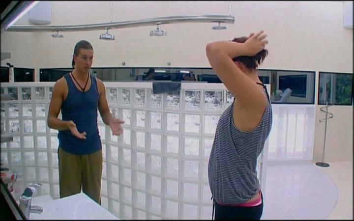 Meanwhile the nominated couple are in the sauna. Jamie says he wants to spend lots of time with Katie - if one of them is going does he make it less hard and spend less time with her or does he go all out and hang out with her all the time? David and Camilla are in the sauna talking about the nominated couple. David says he can't understand them at all. Camilla thought she'd have to comfort Katie today, but didn't. She stands up for what she believes - she is against their behaviour. David wonders why people aren't saying what they think. Camilla says it.s because of Katie - she has proven herself unapproachable, and did have a strong social force behind her in the house, in the past. David says he's much older, but Jamie and Katie have each other so they have an advantage in the house. Camilla says she continues to speak her mind not because she's causing confrontation because she speaks what she believes.